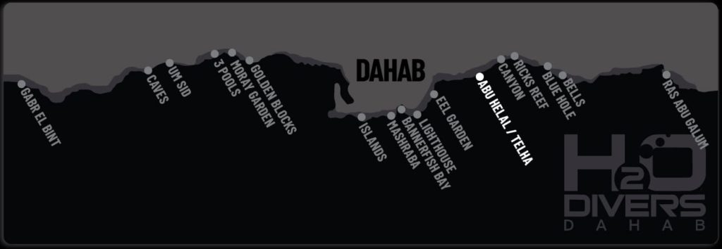 Can be found just south of the Canyon. This divesite is a favourite at H2O and only accessible at high tide. One of the most beautiful and colourful coral gardens in Sinai, the entrance is through a small lagoon. The site can be dived left (or as a drift to Abu Helal) or right and at any depth although the best corals are in 5-20m. It is the only shore diving site where you can find juvenile Red Tooth Triggerfish, sometimes in great numbers. For Tec divers, there is another “Little Canyon” lying at a depth of 40 with chambers dropping down to 105 meters. This dive is suitable for trimix tec divers. Abu Helal is located south of abu Telha, the entrance is via a 10 m deep lagoon created by a crescent shaped reef that opens onto a coral wall dropping to a small Canyon at 30 m. Turtles, Stingrays and Stonefish can be found occasionally.