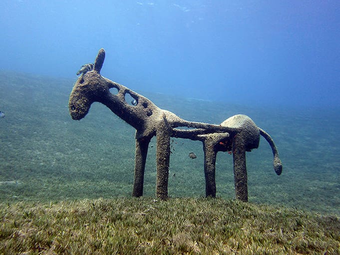 This reef is a 5 minute walk from the dive centre. You can enter on the seagrass part before the bridge and have a look at the underwater statues park, Seahorses and Anemonefish, or enter directly on the reef, at Roman’s rock (20 m) and drift along the wall with nice table corals and gorgonians on your left. At 37 m (deep training), you can find a “swim through” between pinnacles. The turning point is a pinnacle swarming with Glassfish and Anthias. Rays, Groupers, schools of juvenile Catfish, seamoths, spotted seahorses, stonefish and bigger fish can be found at Mashraba.